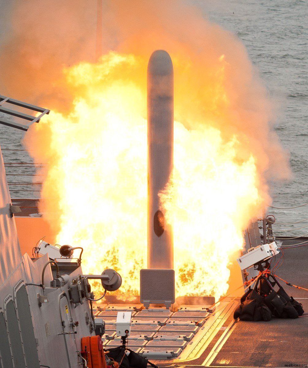 الصورة: صاروخ BGM-109 توماهوك يُطلق من نظام الإطلاق العمودي Mk-41 على متن المدمّرة الأمريكية USS Sterett (DDG 104)