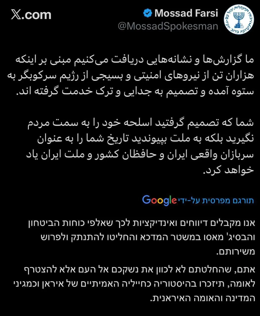 كما وجه الموساد الإسرائيلي رسالة للمحتجين الايرانيين وهذا ما جاء فيها :