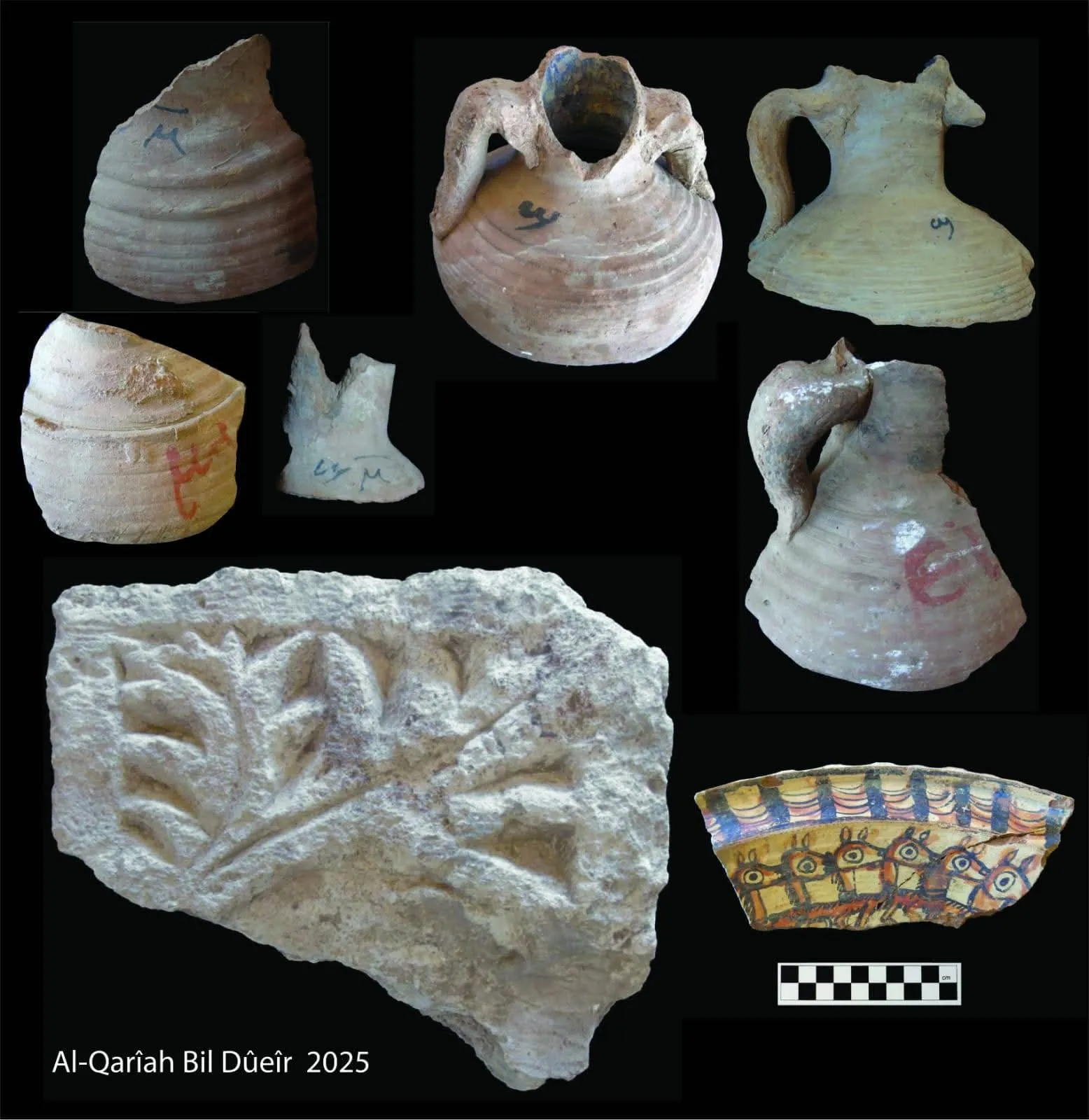 وأوضح وليد السيد رئيس البعثة الأثرية، أن البعثة عثرت بالموقع على عدد من اللقى الأثرية، من بينها أمفورات كانت تُستخدم في التخزين، تحمل بعضها كتابات يُحتمل أن تكون حروفًا أو أرقامًا أو أسماء مدونة على أكتافها، إلى جانب مجموعة من الأوستراكات تحمل كتابات باللغة القبطية، وعدد من أدوات المعيشة، وكسَر حجرية تمثل أجزاء من عناصر معمارية، بالإضافة إلى أجزاء من لوحات من الحجر الجيري منقوش عليها كتابات بالخط القبطي.
