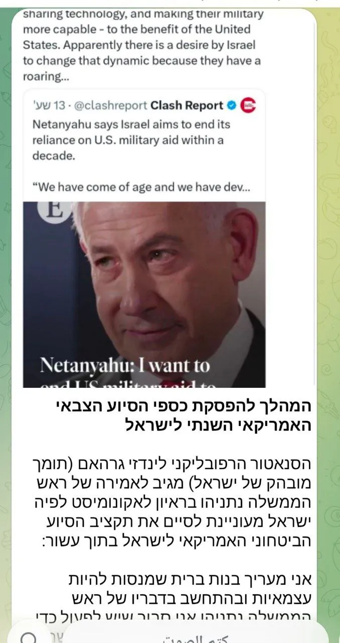 ونقل جويش إنسايدر عن السناتور الأمريكي لينزي غراهام قوله : إنه سيسرع في إيقاف المساعدات الأمريكية لإسرائيل بعد أن أخبر رئيس الوزراء الإسرائيلي نتنياهو مجلة الإيكونوميست أنه يخطط لتقليل الاعتماد على المساعدات الأمريكية خلال السنوات العشر القادمة.
