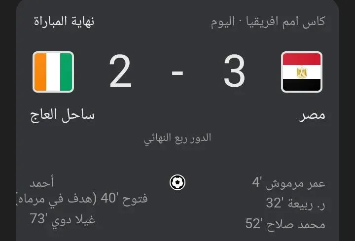 صعد المنتخب القومي المصري إلى الدور قبل النهائي في بطولة كأس الأمم الأفريقية بالمغرب بعد تغلبه على منتخب كوت ديفوار بثلاثة أهداف مقابل هدفين ..أحرز الأهداف مرموش وصلاح وربيعة.