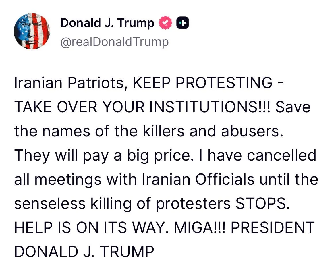 "أيها الوطنيون الإيرانيون، استمروا في الاحتجاج - سيطروا على مؤسساتكم!!! احفظوا أسماء القتلة والمعتدين. سيدفعون ثمنًا باهظًا. لقد ألغيت جميع اجتماعاتي مع المسؤولين الإيرانيين حتى يتوقف القتل العبثي للمتظاهرين. المساعدة قادمة".