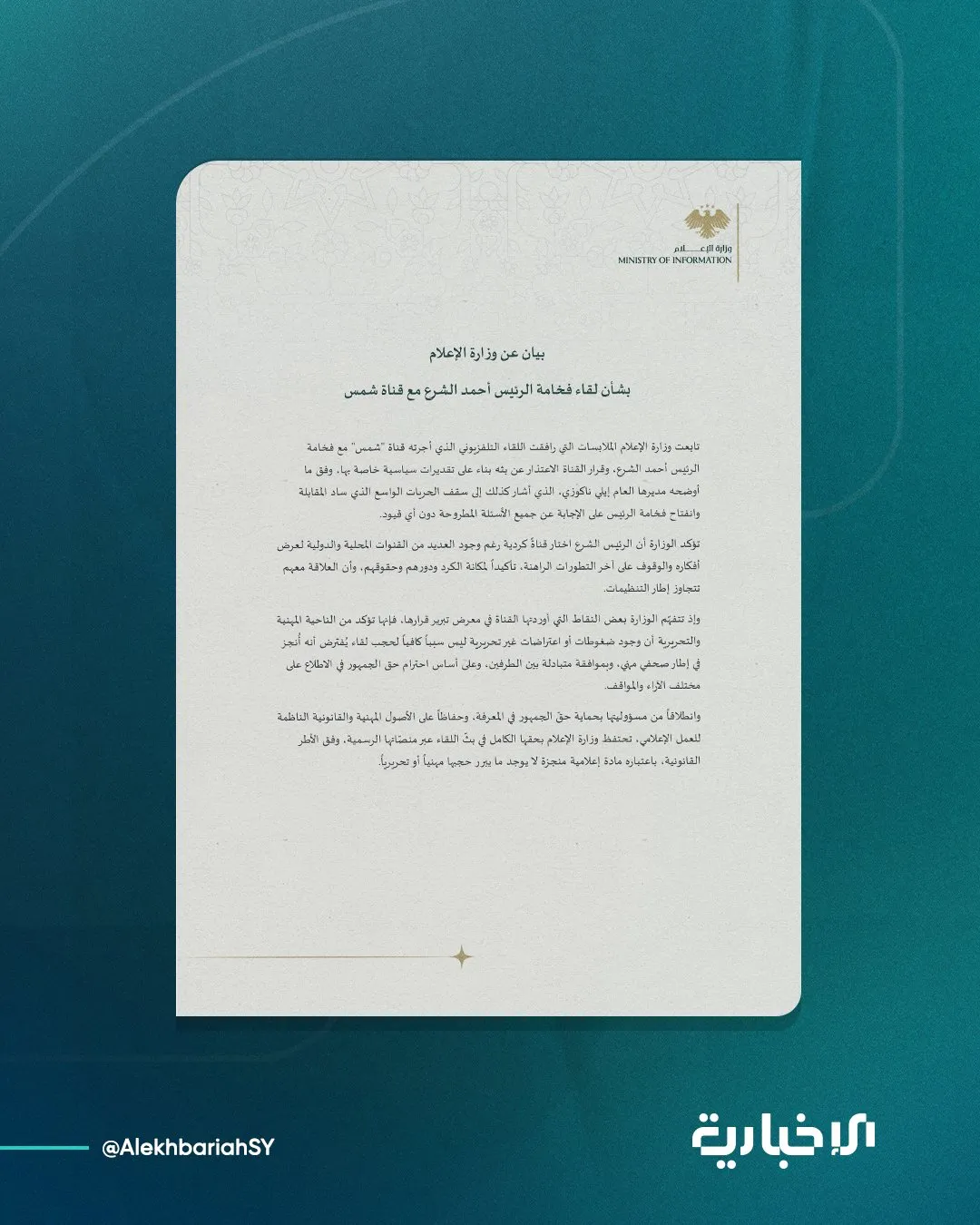 واصدرت وزارة الإعلام السورية بيانا بشأن لقاء السيد الرئيس أحمد الشرع مع قناة شمس:
