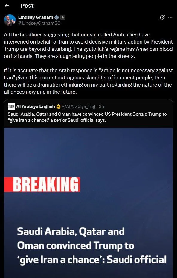 وقال السيناتور غراهام:جميع العناوين الرئيسية التي تشير إلى أن حلفاءنا العرب المزعومين تدخلوا نيابة عن إيران لتجنب عمل عسكري حاسم من جانب الرئيس ترامب هي مزعجة للغاية. نظام آية الله لديه دم أمريكي على يديه. إنهم يذبحون الناس في الشوارع.