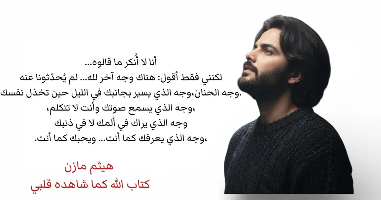 وأوضح هيثم مازن أن كتابه الجديد يأتي في إطار تجربة إنسانية وروحية خاصة، تعتمد على الخواطر والتأملات، وتسعى إلى تقديم رؤية وجدانية لاكتشاف وجود الله في تفاصيل الحياة اليومية، من خلال الإحساس العميق، والطمأنينة الداخلية، واليقين القلبي الذي يتشكل بعيدًا عن الصخب والضجيج.