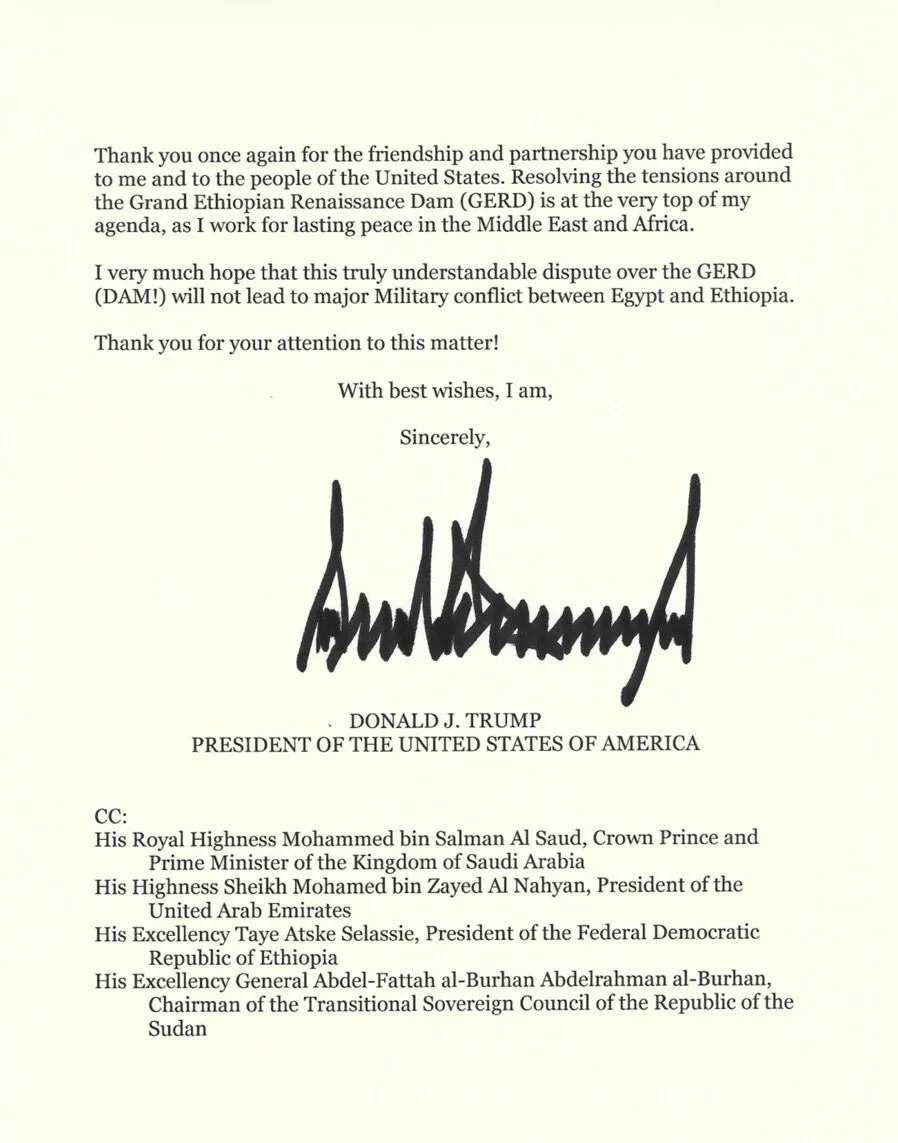 أتقدم إليكم مجدداً بجزيل الشكر على الصداقة والشراكة التي قدمتموها لي ولشعب الولايات المتحدة. إن حل التوترات المحيطة بسد النهضة الإثيوبي يمثل أولوية قصوى بالنسبة لي، إذ أسعى جاهداً لتحقيق سلام دائم في الشرق الأوسط وأفريقيا.