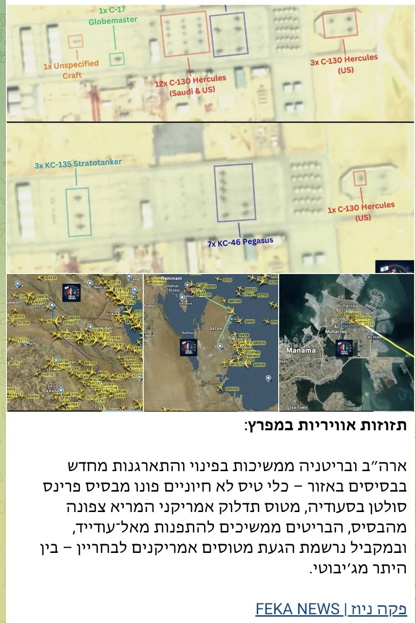 تواصل الولايات المتحدة وبريطانيا عمليات الإخلاء وإعادة التنظيم في القواعد بالمنطقة – تم إخلاء الطائرات غير الضرورية من قاعدة الأمير سلطان في السعودية، أقلعت طائرة تزويد أمريكية شمالاً من القاعدة، ويواصل البريطانيون الإخلاء من الوعيد، وفي الوقت نفسه تم تسجيل وصول طائرات أمريكية إلى البحرين – من بينها من جيبوتي.