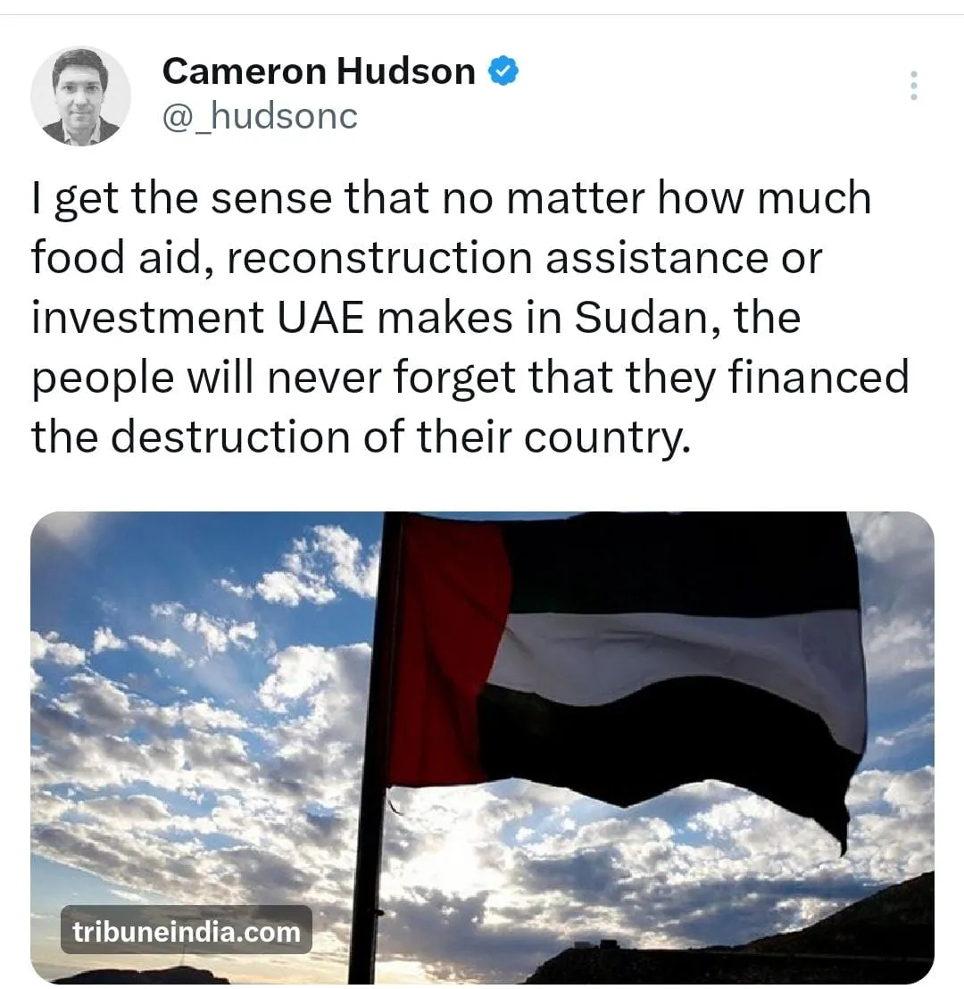وما يدّعيه كاميرون هيدسون عن الإمارات من سعي إلى "انفصال السودان" أو "تقسيمه" أو "بناء محور انفصاليين" ما هو إلا اختلاقات غير واقعية، مبالغات دعائية خالية من أي أساس رسمي أو وثيقة إماراتية تدعمها. الإمارات أكدت مراراً التزامها بوحدة السودان وسيادته وسلامة أراضيه، وشاركت في جهود الوساطة الدولية لإنهاء الحرب بحل سياسي موحد، لا تقسيم. فإما أن الرجل مصاب بلوثة دماغية جعلته عاجزاً عن تمييز الخيط الأبيض من الخيط الأسود، أو أنه يتعمد النفاق والتضليل لأجندة شخصية أو سياسية واضحة. في كل الأحوال، مصداقيته في هذا