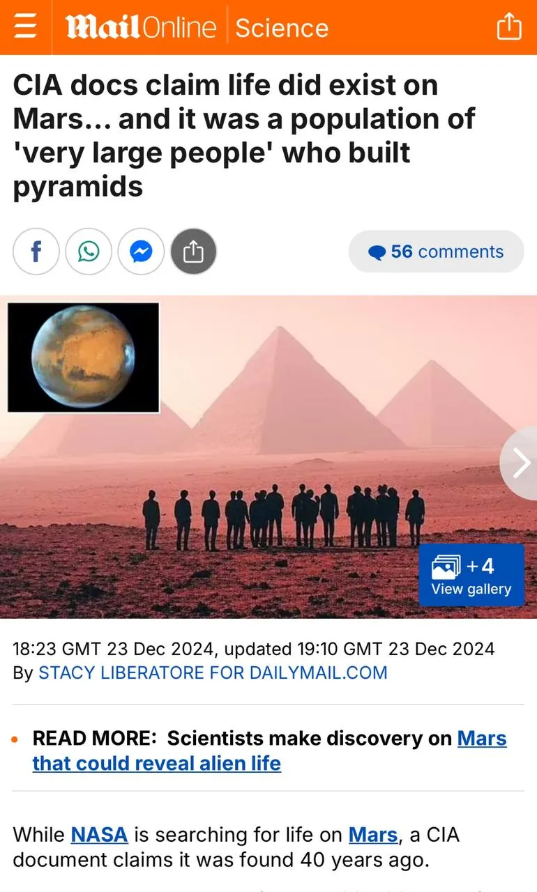 تقول الوثيقة إن الوكالة لاحظت مظاهر لحياة قديمة تعود إلى أكثر من مليون عام كانت على كوكب المريخ، اتسم سكانها بالطول والنحافة الشديدة، وتميزوا ببناء الأهرامات تمامًا كأهرامات الفراعنة الموجودة في مصر.