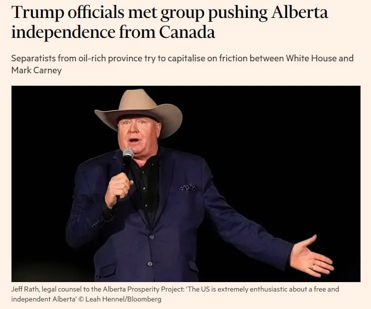 ذكر موقع ديلي بيست أن كبار مسؤولي إدارة ترامب اجتمعوا سراً ثلاث مرات في واشنطن مع قادة مجموعة كندية تُدعى "مشروع ازدهار ألبرتا" منذ أبريل 2025. هذه المجموعة تدفع نحو استقلال ولاية ألبرتا الغنية بالنفط عن كندا.
