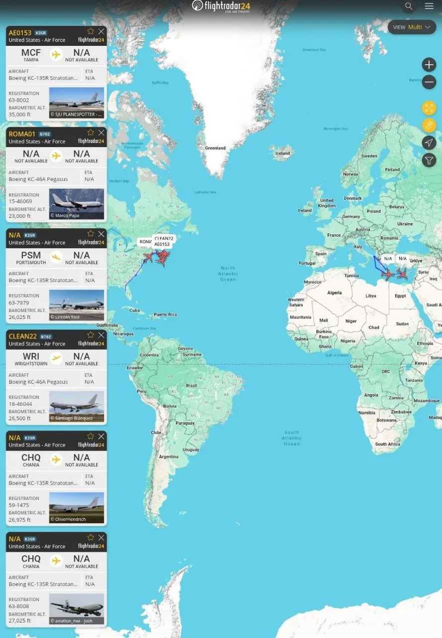 تشهد القوات الجوية الأمريكية اليوم 17 فبراير تحركاً عسكرياً واسعاً لنقل 48 مقاتلة إلى الشرق الأوسط حيث تشمل العملية 36 طائرة F-16 و12 طائرة F-22 Raptor قادمة من قواعد في ألمانيا وإيطاليا والولايات المتحدة وترافق هذه المقاتلات أسراب من طائرات التزود بالوقود جواً لضمان عبورها المحيط الأطلسي وأوروبا وصولاً إلى وجهتها النهائية في منطقة الشرق الأوسط.