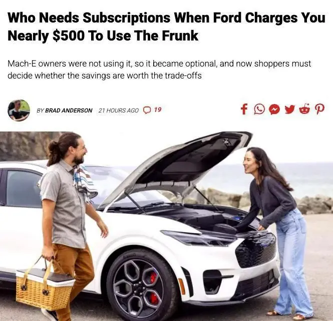 تخيل أن تشتري سيارة كهربائية فاخرة بـ50 ألف دولار، ثم تُطلب منك دفع مبلغ إضافي لاستخدام صندوق الأمتعة الأمامي الذي رُكّب بالفعل فيها من المصنع!