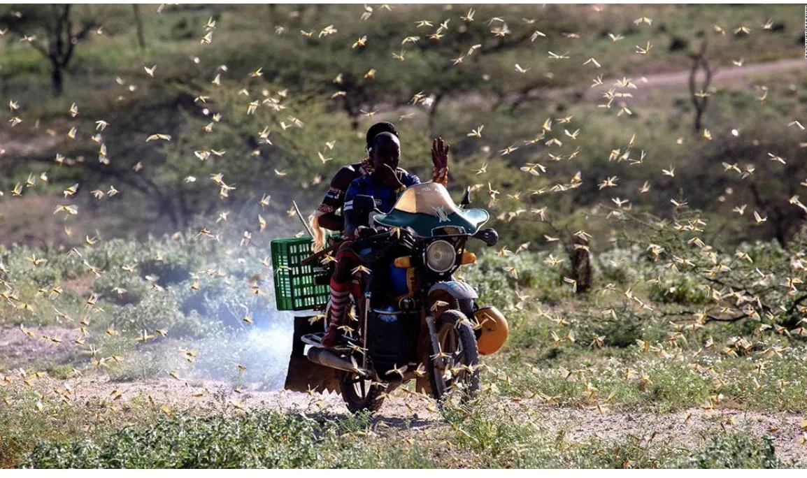 فوجيء سائقو المركبات وسط أهوال الصحراء الكبرى بأسراب جراد هائلة الكثافة غطت الطريق الرئيسي تماماً، وحجبت الرؤية وتسببت في وقوع تصادمات عنيفة بين المركبات.