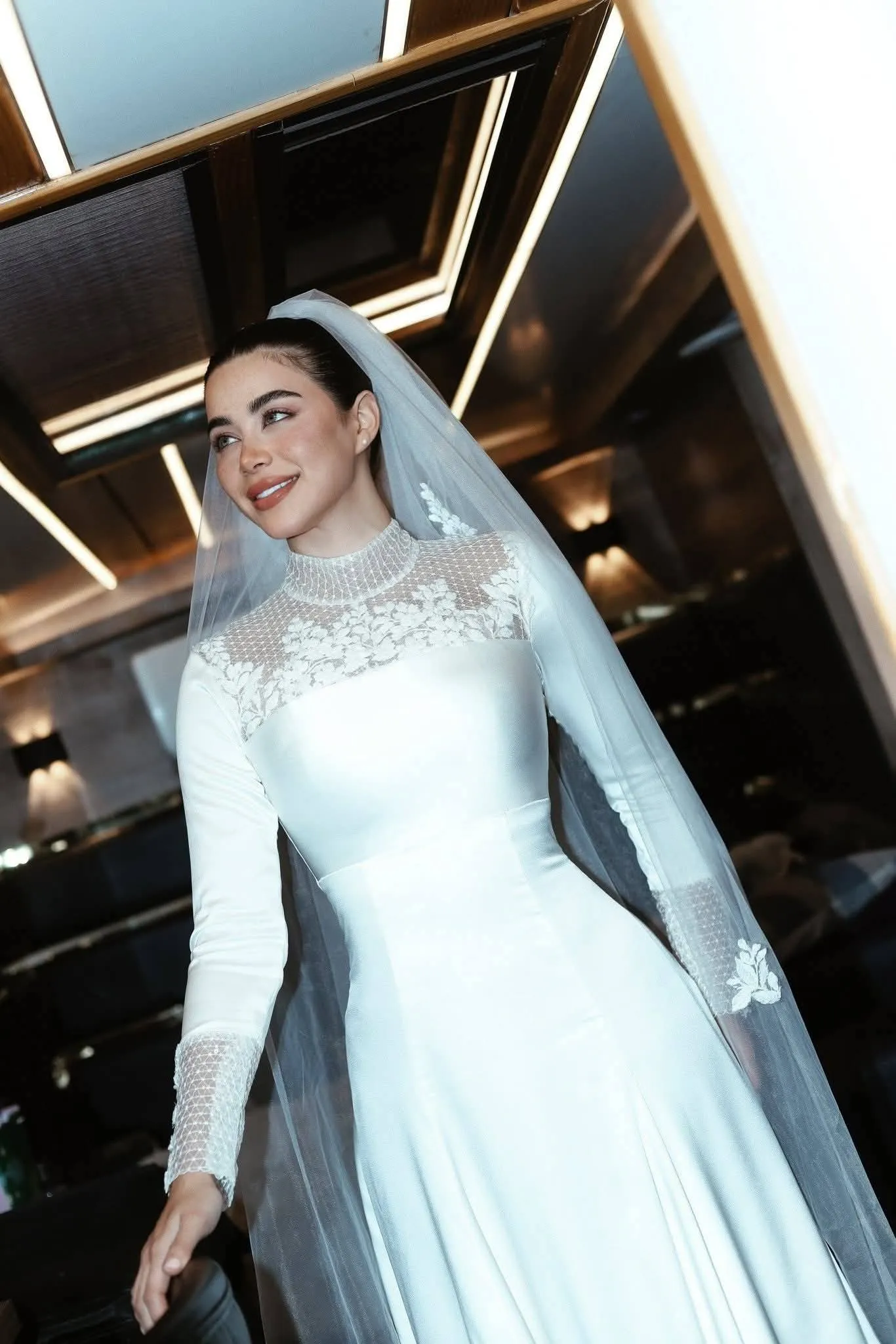 وجاء التصميم بطابع كلاسيكي راقٍ يجمع بين الاحتشام والرقي، إذ تميز بقصّة انسيابية بأكمام طويلة وياقة مرتفعة شفافة مطرزة بتفاصيل دانتيل دقيقة، مع تطريز ناعم على منطقة الصدر والأكمام، ما منح الإطلالة طابعًا ملكيًا هادئًا. كما أضفت الطرحة الطويلة لمسة رومانسية عززت من حضور المشهد دراميًا وبصريًا.
