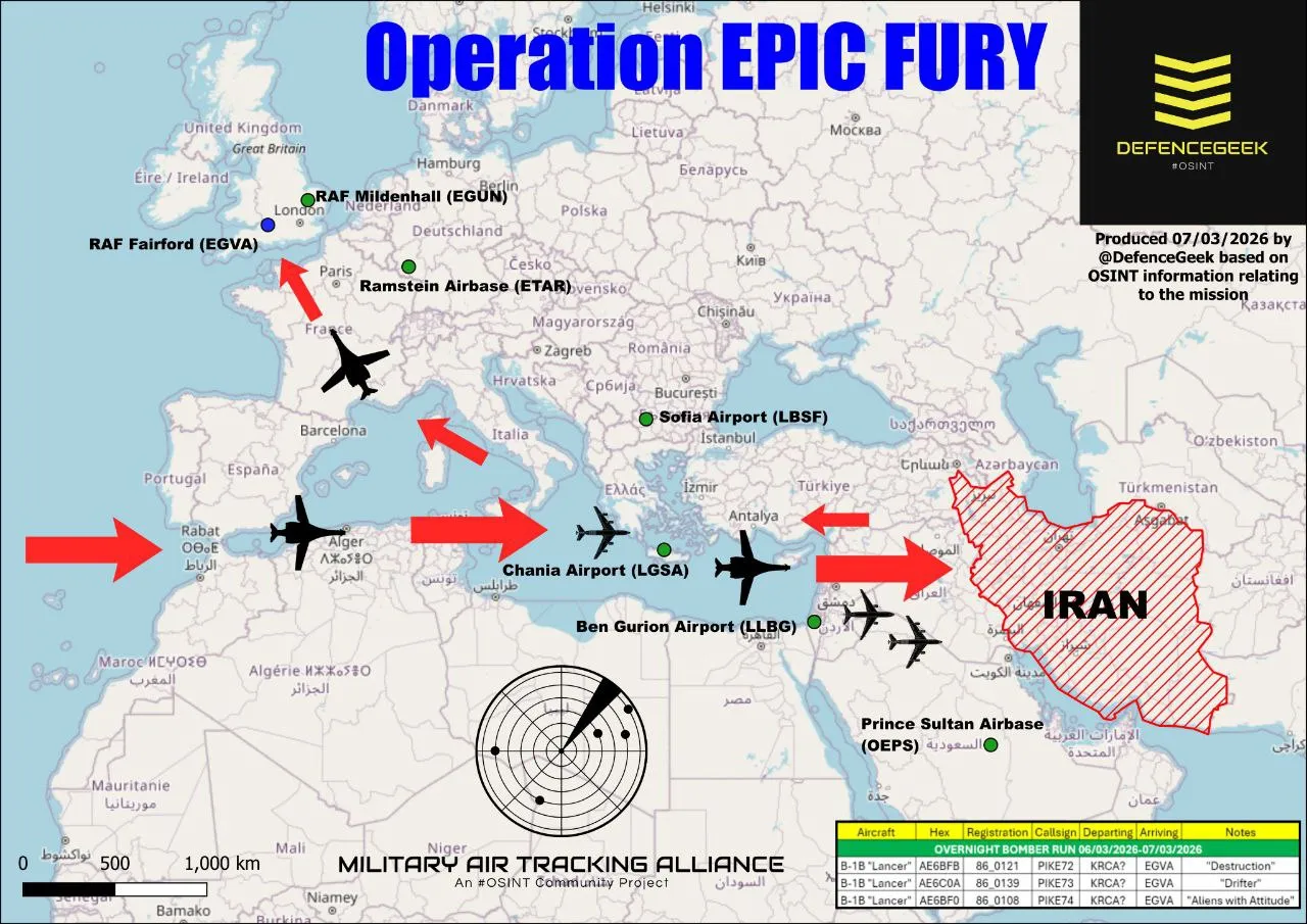 في إطار عملية الغضب الملحمي أعادت الولايات المتحدة تموضع قاذفات استراتيجية من طراز B-1B Lancer في قاعدة فيرفورد بالمملكة المتحدة تهدف هذه الخطوة إلى تقليص المسافات لمهام الضربات الجوية تجاه إيران ورفع وتيرة العمليات مع فتح المجال لقواعد أخرى مثل دييغو غارسيا وقبرص لتقديم الدعم اللوجستي اللازم.