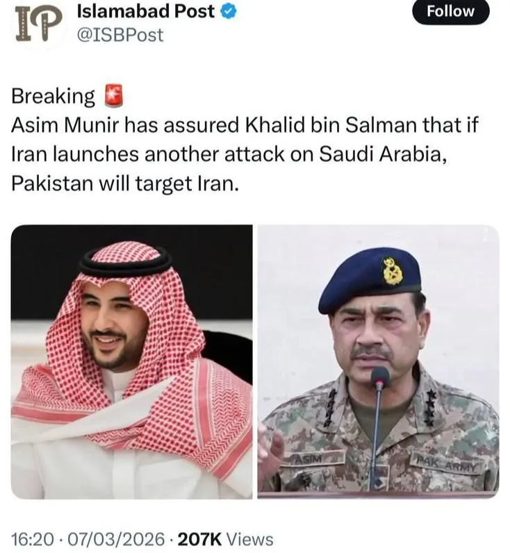 في خطوة تعكس عمق التحالف الاستراتيجي بين إسلام آباد والرياض، أكد الجنرال عاصم منير، قائد الجيش الباكستاني، لسمو الأمير محمد بن سلمان ولي العهد السعودي، استعداد بلاده للرد الفوري والحاسم على أي هجوم إيراني محتمل آخر يستهدف المملكة العربية السعودية.