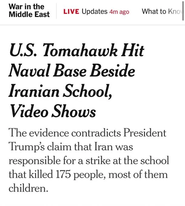 نفت صحيفة "نيويورك تايمز" ادعاءات الرئيس الأمريكي دونالد ترامب بشأن مسؤولية طهران عن قصف مدرسة "شجرة طيبة" الابتدائية، مؤكدة تورط صاروخ أمريكي في الهجوم الذي أودى بحياة 168 طفلة.