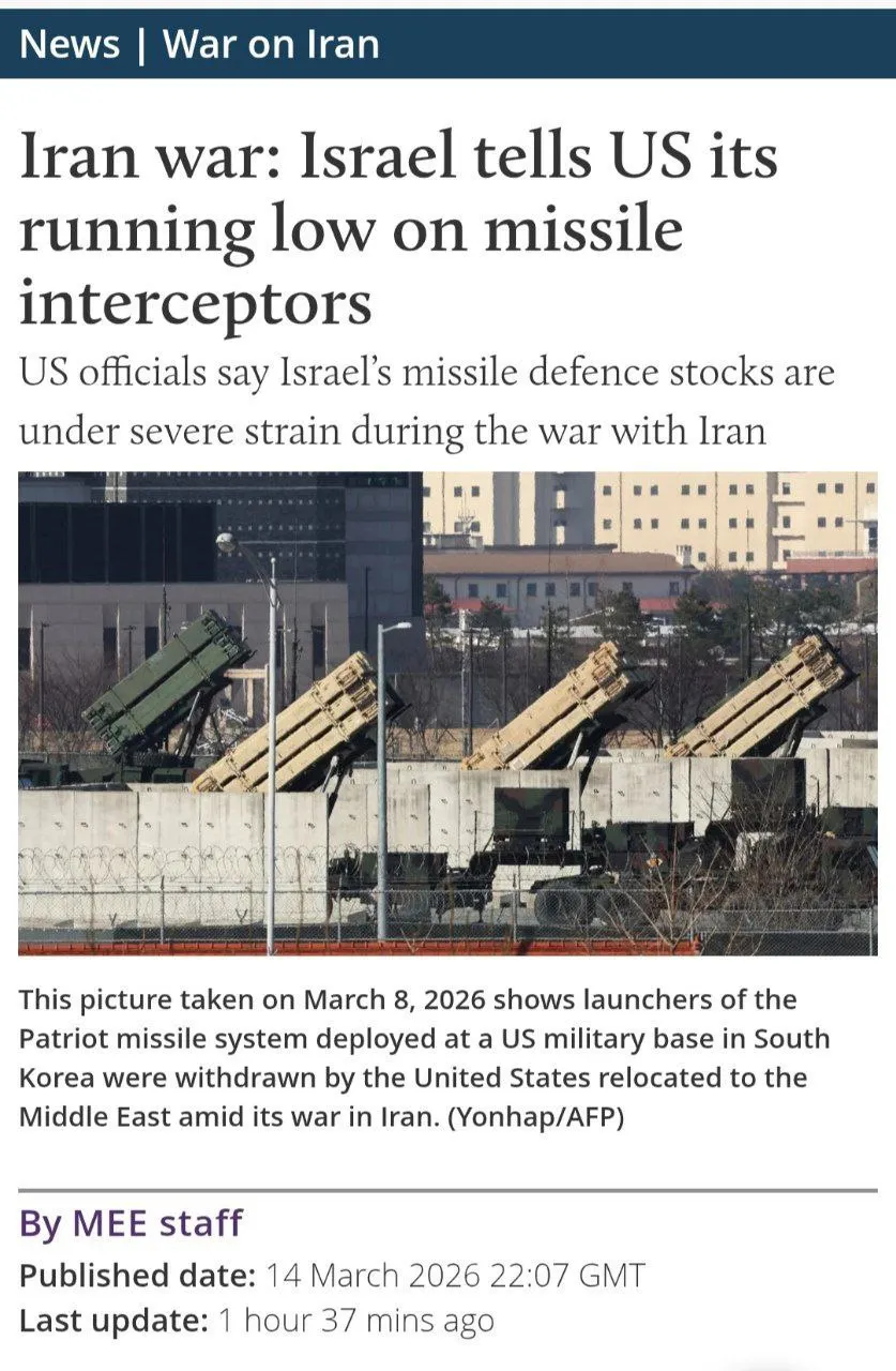 إسرائيل تُبلغ الولايات المتحدة بنقص حاد في صواريخ الاعتراض يقول مسؤولون أمريكيون إن مخزون الدفاع الصاروخي الإسرائيلي يتعرض لضغط شديد خلال الحرب مع إيران!!