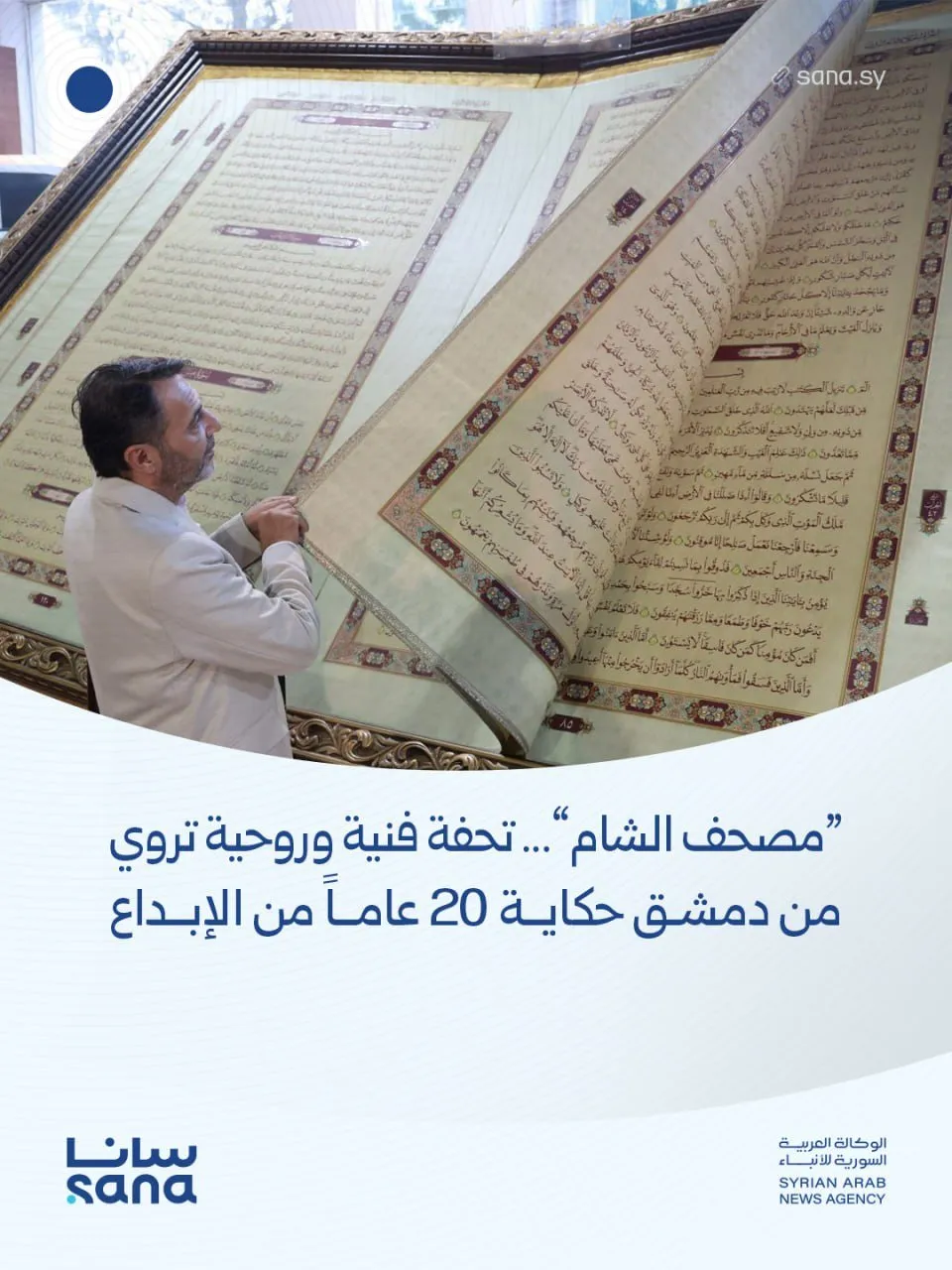 في لحظة تاريخية مشرفة، أُزيح الستار عن "مصحف الشام"، أضخم مصحف مطَوّر في العالم بطول يفوق 7 أمتار وعرض 5 أمتار، خلال احتفالات ليلة القدر المباركة في المسجد الأموي الشهير، أحد أقدم وأعظم المساجد في التاريخ الإسلامي والمسجل ضمن التراث العالمي لليونسكو يعود بنائه إلى عهد الخليفة الوليد بن عبد الملك.