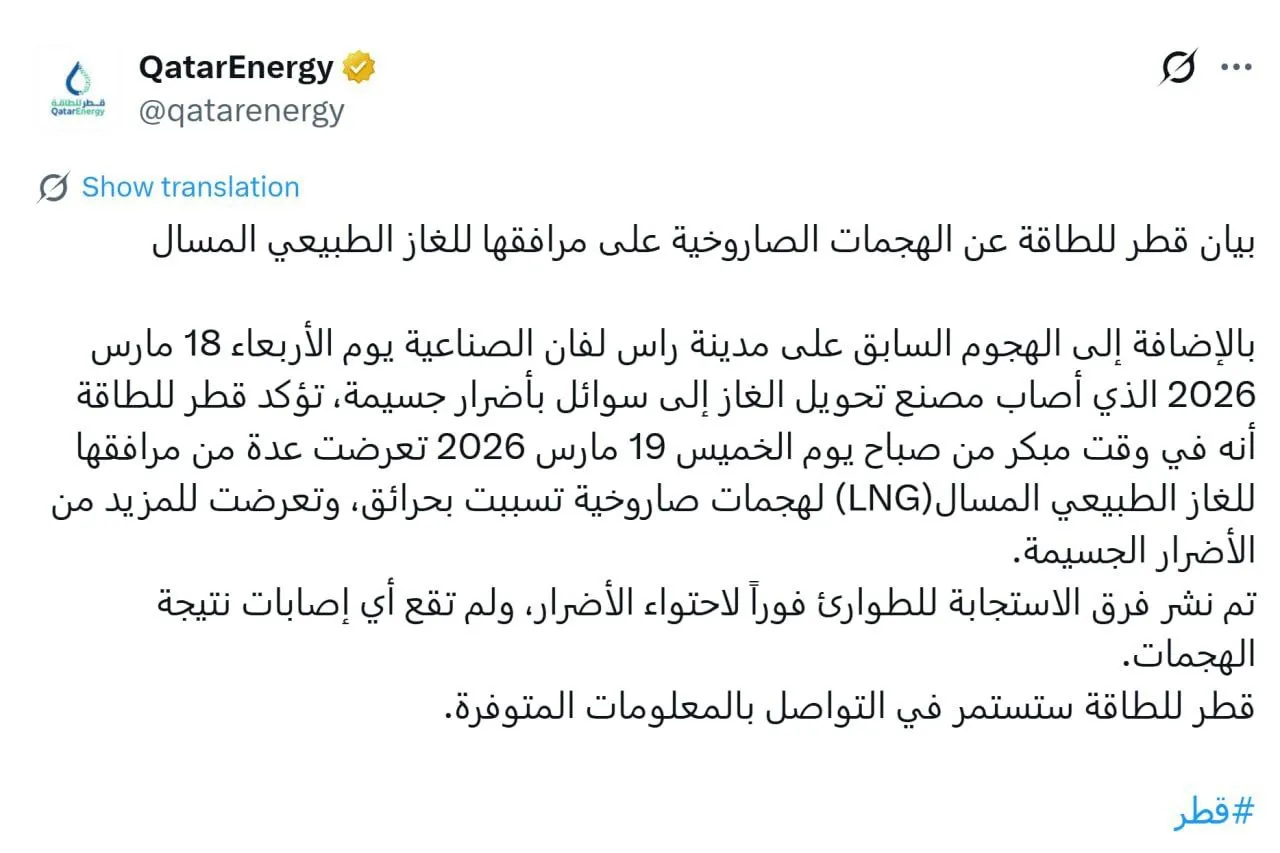 - تعرضت عدة مرافق للغاز الطبيعي المسال (LNG) لهجمات صاروخية مباشرة في ساعات الصباح الباكر