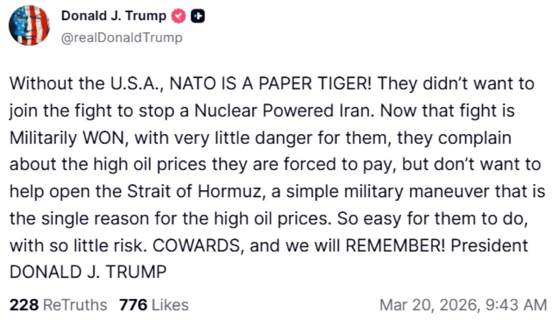 كتب الرئيس الأمريكي دونالد ترامب منشورا على منصة تروث سوشيال مخاطبا أوروبا للناتو أنتم جبناء ولن ننسى: موقفكم من الحرب الإيرانية.