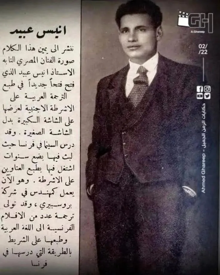 في عالم السينما المصرية، يبرز اسم المهندس أنيس عبيد (1910-1988) كرمز ثقافي استثنائي، إذ كان الرائد الأول في مصر والعالم العربي الذي ابتكر تقنية طباعة الترجمة مباشرة على شرائط الأفلام الأجنبية في أواخر الثلاثينيات من القرن الماضي.