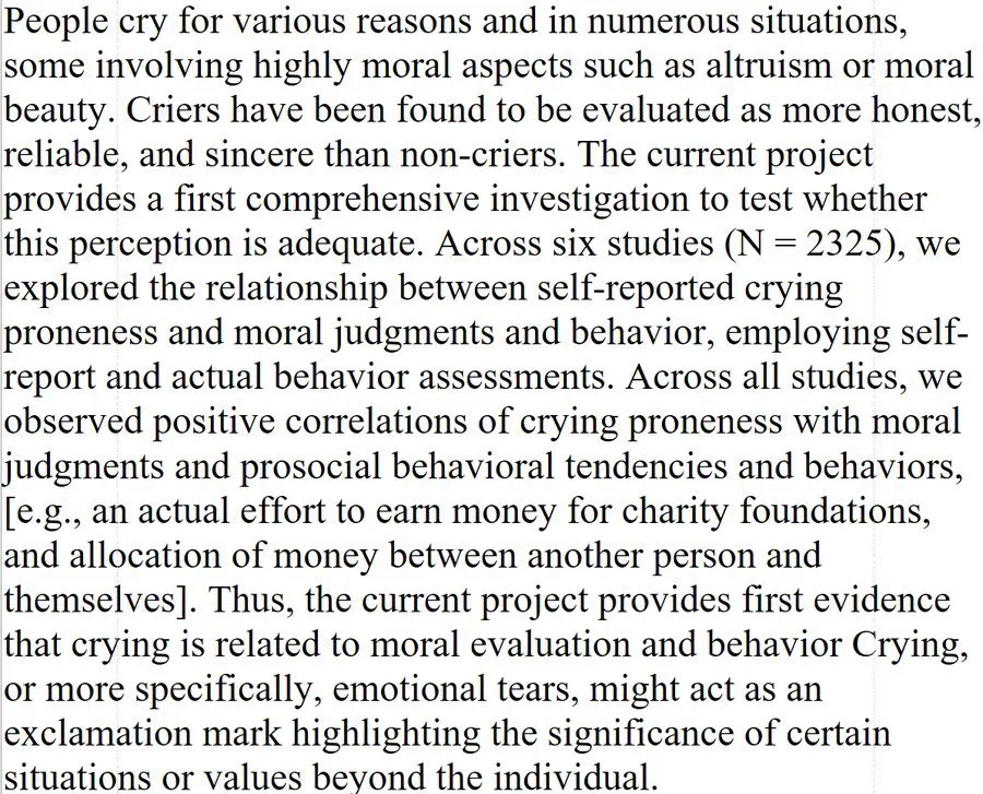 تدعم هذه الاكتشافات مقولة قديمة شهيرة تقول: "فقط الطيبون يبكون"، وتفتح الباب أمام إعادة تقييم البكاء كعلامة قوة عاطفية تعكس نضجًا أخلاقيًا، لا ضعفًا.