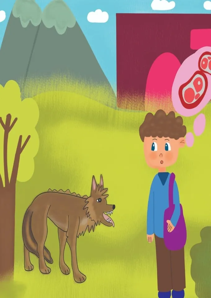 تَذَكَّرَ حامِدُ أنَّ الذِّئْبَ يُحِبُّ اللَّحْمَ , ولِهَذا رَمي نَحْوَهُ قِطْعَةَ لَحْمٍ كَبيرَةٍ منْ اللَّحْمِ الذِّي مَعَهُ , واتَّجَهَ الذِّئْبُ نَحْوها علَي الفَوْرِ وشَمَّها , ولِكِنَّهُ سُرْعانَ ما عادَ إلَي حامِدَ , وحينَئِذٍ تَذَكَّرَ حامِدُ أنَّ مَعَهُ سِكِّيناً فَأَخْرَجَها علَي الفَوْرِ وأَخْفاها خَلْفَ ظَهْرِهِ , واتَّجَهَ إلَي مَنْزِلِ خالَتِهِ مُسْرِعاً , وجَرَي الذِّئبُ خَلْفَهُ .