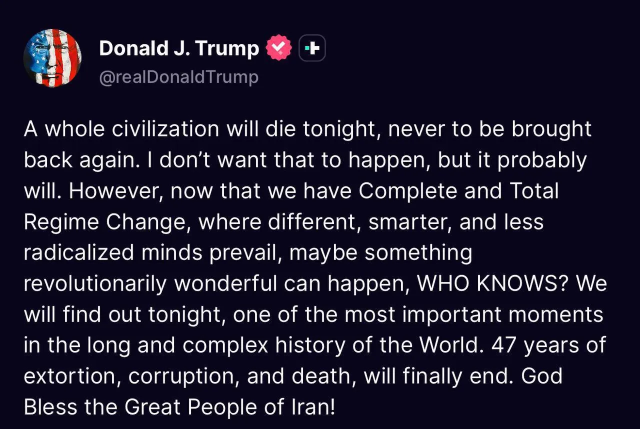 كتب الرئيس الأمريكي دونالد ترامب على منصة تروث سوشيال: ستموت حضارة كاملة الليلة، ولن يتم إحياؤها مرة أخرى أبدًا. لا أريد أن يحدث ذلك، لكنه سيحدث على الأرجح.
