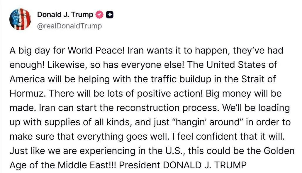 يوم كبير من أجل السلام العالمي! إيران تريد أن يحدث ذلك، لقد سئمت! وكذلك الجميع! ستساعد الولايات المتحدة الأمريكية في تخفيف الازدحام الملاحي في مضيق هرمز. سيكون هناك الكثير من الإجراءات الإيجابية! سيتم تحقيق أموال طائلة. يمكن لإيران أن تبدأ عملية إعادة الإعمار. سنقوم بتجهيز إمدادات من جميع الأنواع، وسنكون “متواجدين” فقط للتأكد من أن كل شيء يسير على ما يرام. أشعر بالثقة بأن الأمر سيكون كذلك. تمامًا كما نعيشه في الولايات المتحدة، قد يكون هذا هو العصر الذهبي للشرق الأوسط!!!