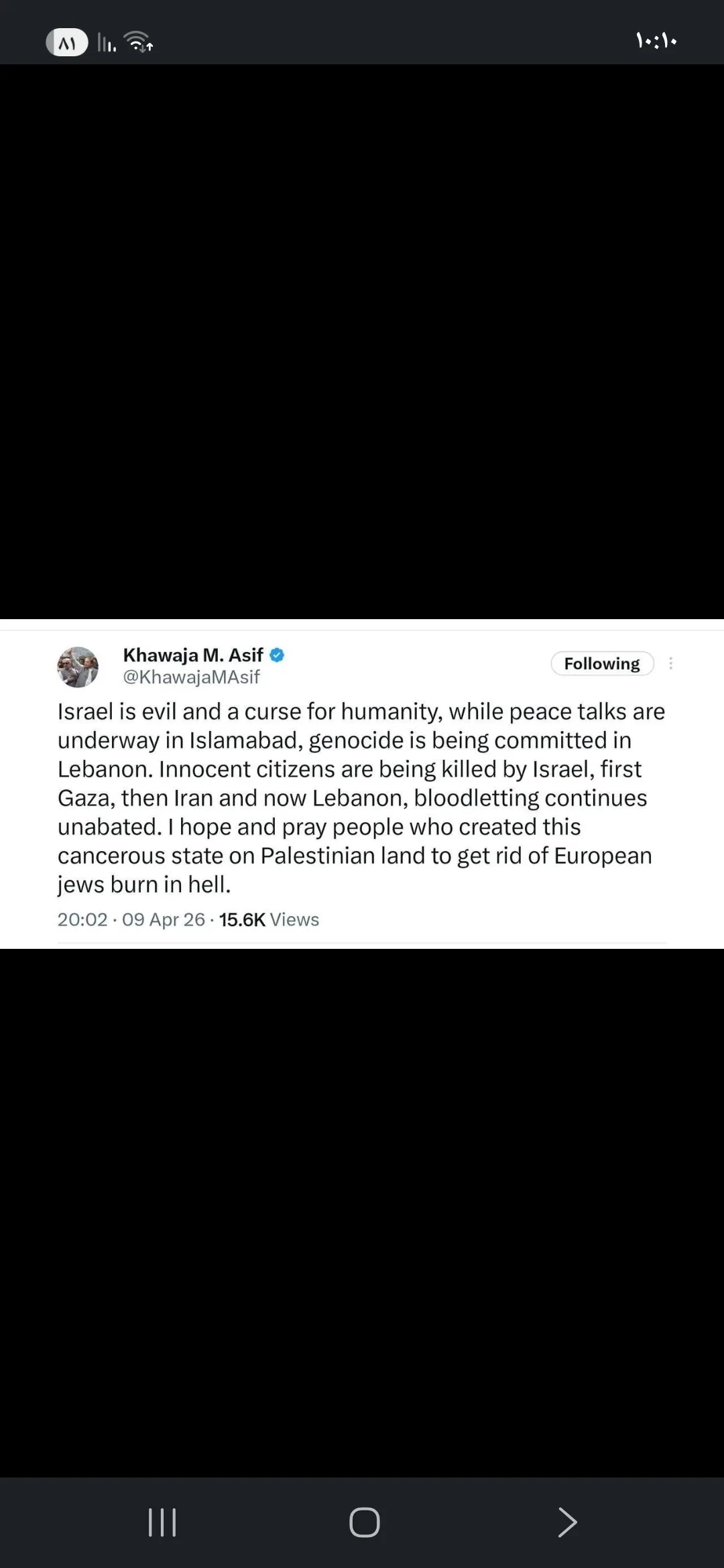 " إسرائيل شريرة ولعنة على الإنسانية، فبينما تجري مباحثات السلام في إسلام آباد، ترتكب إبادة جماعية في لبنان حيث يقتل مواطنون أبرياء على يد إسرائيل أولا في غزة، ثم إيران والآن لبنان.