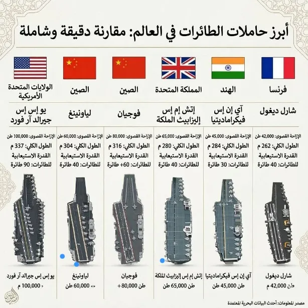 من بين حاملات الطائرات المذكورة هناك اثنتان فقط تعملان بالدفع النووي وهما: