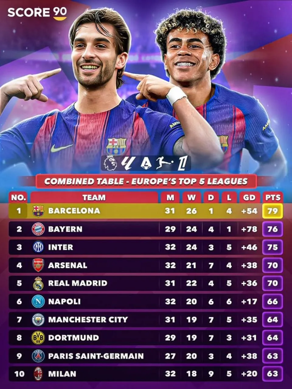 إليكم الـTop 10 الكامل من Score90، حيث الريال (70 نقطة) يصارع الريال، ومان سيتي ودورتموند يتنافسان بشراسة: