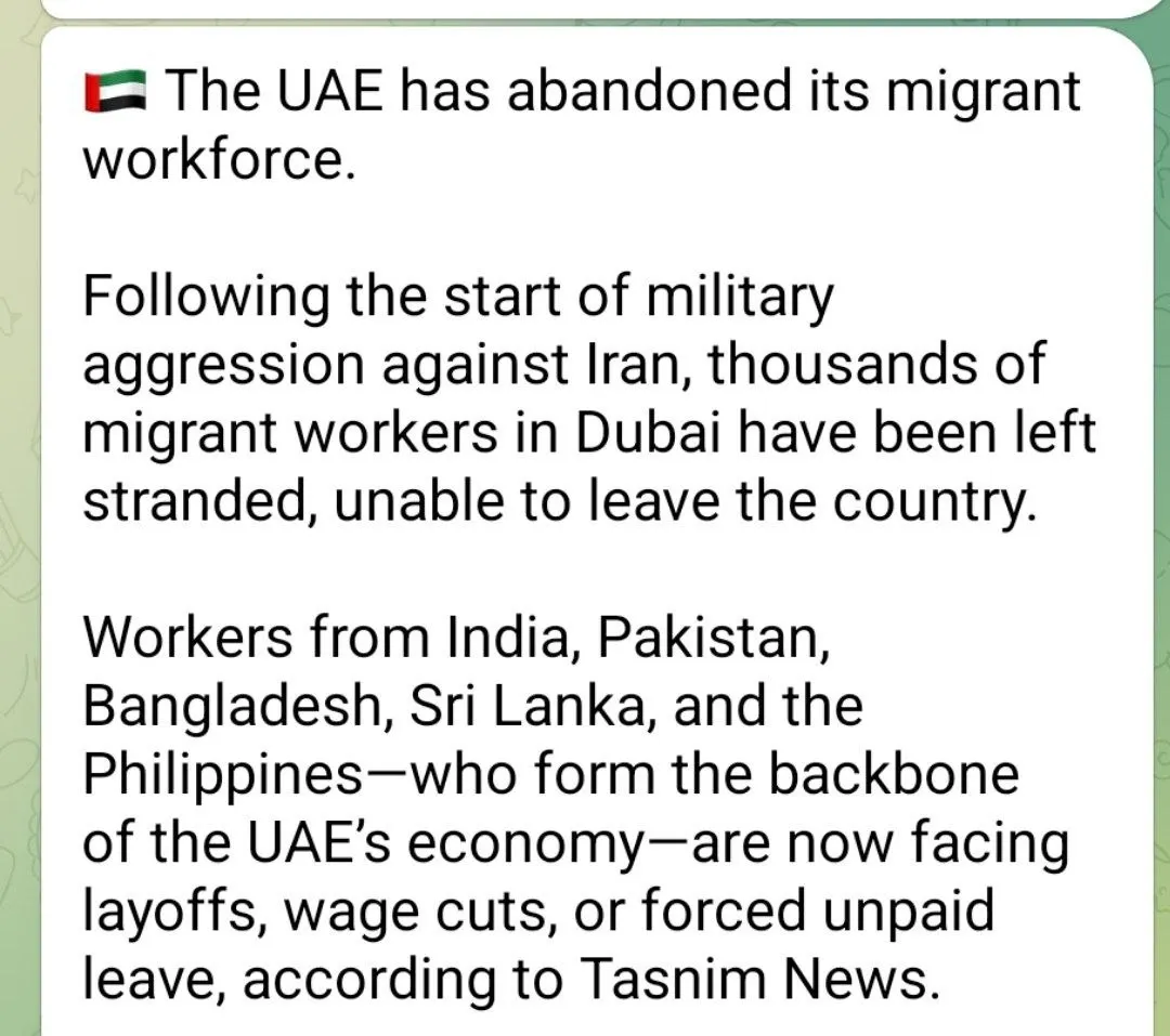 في خضم الاضطرابات الإقليمية المتصاعدة عقب اندلاع الحرب على إيران، كشفت وكالة تسنيم أن الإمارات العربية المتحدة عن اتخذت إجراءات مشددة ضد عمالتها المهاجرة، التي شكلت لعقود عماد اقتصادها النابض. آلاف العمال من الهند وباكستان وبنغلاديش وسريلانكا والفلبين – الذين يمثلون نحو 90% من القوة العاملة في قطاعات البناء والخدمات والسياحة – يجدون أنفسهم اليوم عالقين في دبي وغيرها من الإمارات، محاصرين بين التهديدات الأمنية والانهيار الاقتصادي، غير قادرين على العودة إلى بلدانهم بسبب إغلاق المطارات جزئياً وتعطل الرحلات الجوية.