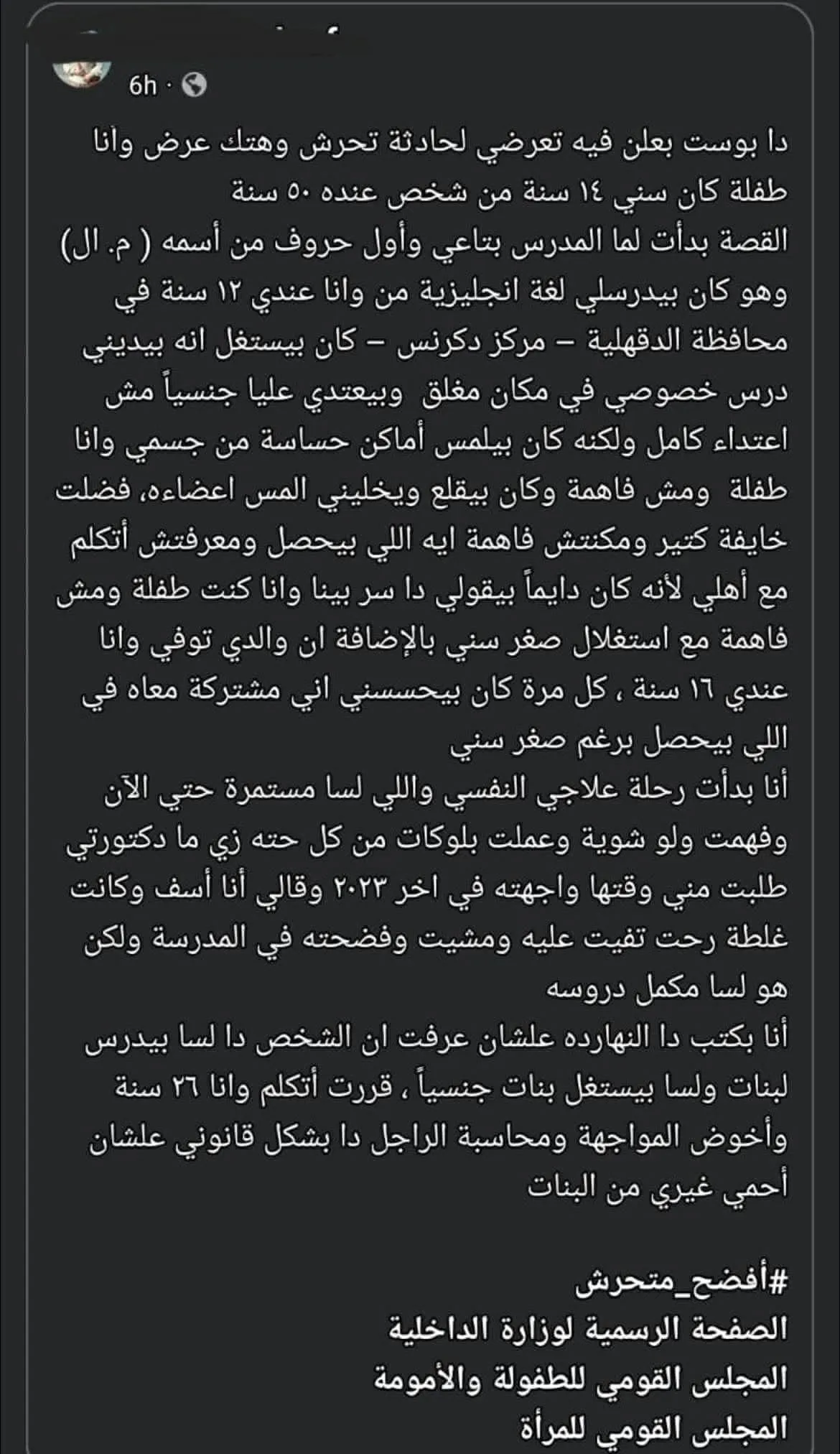 تداول رواد مواقع التواصل الاجتماعي منشورًا لفتاة تبلغ من العمر 26 عامًا، وجهت خلاله استغاثة إلى وزارة الداخلية، طالبت فيها بالتحقيق في واقعة قالت إنها تعرضت لها قبل نحو 14 عامًا أثناء تلقيها دروسًا خصوصية في مادة اللغة الإنجليزية بمدينة دكرنس بمحافظة الدقهلية.