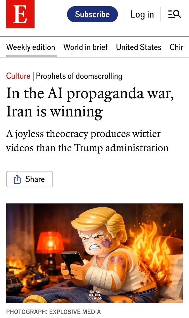 أعلنت مجلة "ذا إيكونوميست" في عددها الصادر بتاريخ 17 أبريل 2026، تحت عنوان "في حرب الدعاية بالذكاء الاصطناعي، إيران تفوز"، أن طهران قد نجحت في قلب معادلة الرأي العام الأمريكي رأسًا على عقب.