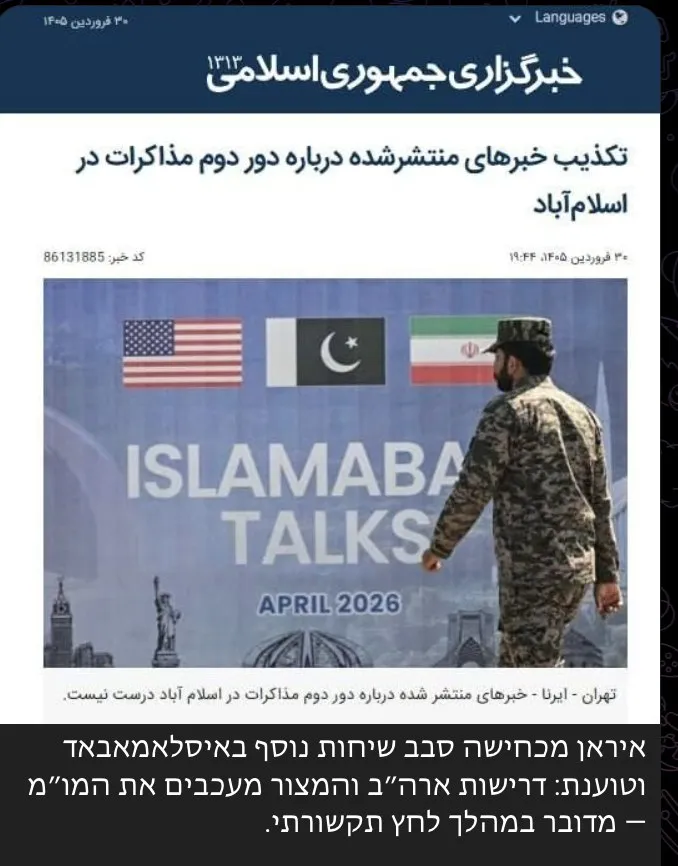 في إسرائيل يقدّرون حتى هذا المساء أن دونالد ترامب يريد التوصل إلى اتفاق، وأنه في حال لم يتم التوصل إلى تفاهمات في المفاوضات في باكستان، فمن المرجح بدرجة كبيرة أن يتم تمديد وقف إطلاق النار لإتاحة مزيد من المحادثات. في المقابل، الاستعداد قائم لاحتمال أن تتجدد الحرب بشكل مفاجئ.