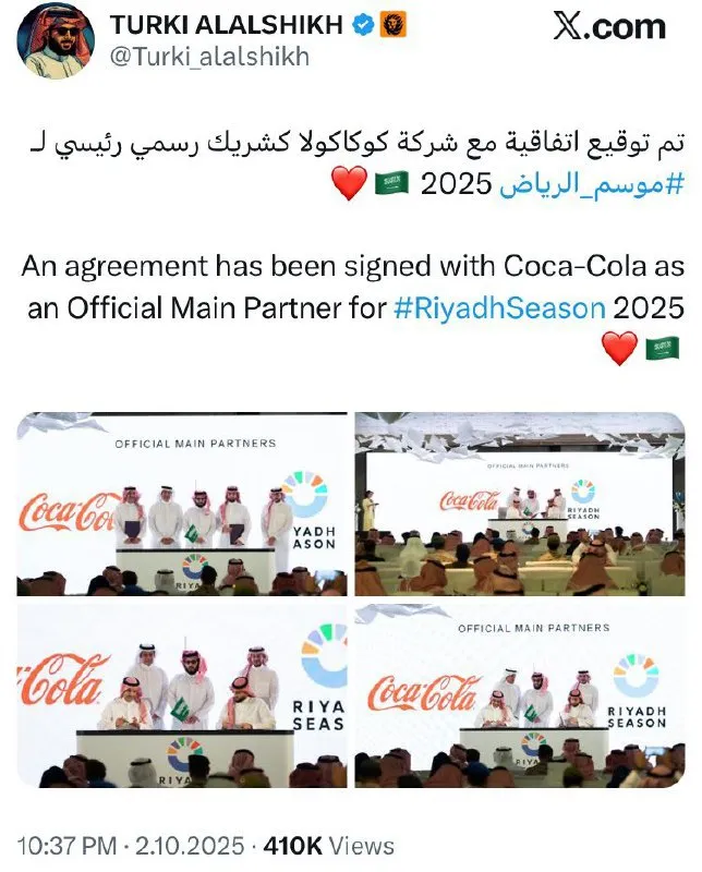 جدير بالذكر أن شركة كوكاكولا التي تستثمر مليارات الدولارات في بناء المستوطنات الإسرائيلية على أنقاض منازل الفلسطينيين واجهت مقاطعة شرسة عالميًا وأعلن تركي آل الشيخ رسميًا توقيع اتفاقية مع شركة كوكاكولا كشريك رسمي رئيسي لموسم الرياض. الشركة الداعمة للحرب على أطفال غزة.