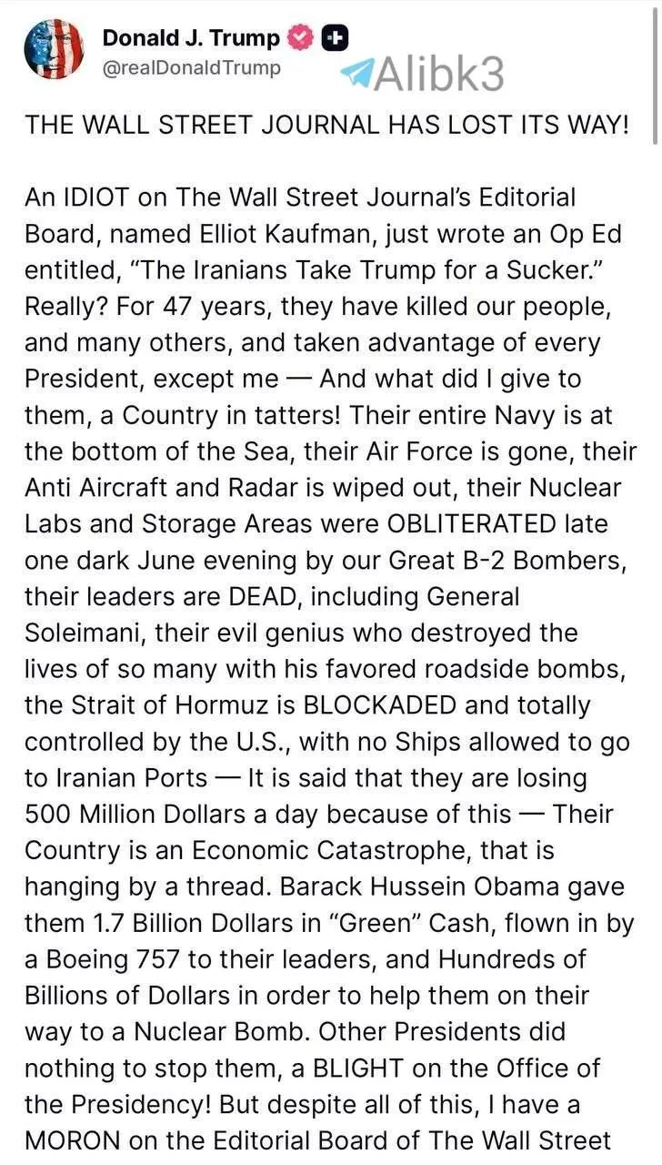 كتب أحمقٌ في هيئة تحرير صحيفة وول ستريت جورنال، يُدعى إليوت كوفمان، مقالًا بعنوان "الإيرانيون يخدعون ترامب". حقًا؟ على مدى 47 عامًا، قتلوا شعبنا، وشعوبًا أخرى كثيرة، واستغلوا كل رئيس، باستثنائي - وماذا قدمت لهم؟ بلدًا مُدمّرًا! أسطولهم البحري غارقٌ في قاع البحر، وقواتهم الجوية مُدمّرة، ودفاعاتهم الجوية وراداراتهم مُدمّرة، ومختبراتهم النووية ومخازنها مُسوّاةٌ بالأرض في إحدى ليالي يونيو المظلمة على يد قاذفاتنا بي-2 العظيمة، وقادتهم أموات، بمن فيهم الجنرال سليماني، عبقريهم الشرير الذي دمّر حياة الكثيرين بقنابله المزروعة على جوانب الطرق، ومضيق هرمز مُحاصرٌ وتسيطر عليه الولايات المتحدة تمامًا، ولا يُسمح لأي سفينة بالوصول إلى الموانئ الإيرانية - ويُقال إنهم يخسرون 500 مليون دولار يوميًا بسبب هذا - بلادهم كارثة اقتصادية، على وشك الانهيار. قدّم باراك حسين أوباما لهم 1.7 مليار دولار نقدًا، نُقلت جوًا على متن طائرة بوينغ 757 إلى قادتهم، ومئات المليارات من الدولارات لمساعدتهم في طريقهم نحو امتلاك قنبلة نووية. لم يفعل الرؤساء الآخرون شيئًا لإيقافهم، يا له من عار على منصب الرئاسة! ولكن على الرغم من كل هذا، لديّ أحمق في هيئة تحرير صحيفة وول ستريت جورنال يكتب عني بأنني "ساذج". إيران بالتأكيد لا تعتقد ذلك! ولا أي شخص آخر. أعتقد أن روبرت مردوخ أمره بالكتابة بهذه الطريقة، لأن صحيفة وول ستريت جورنال قد ضلت طريقها، ولم تعد قراءة ضرورية، بل مجرد صحيفة سياسية فاشلة.