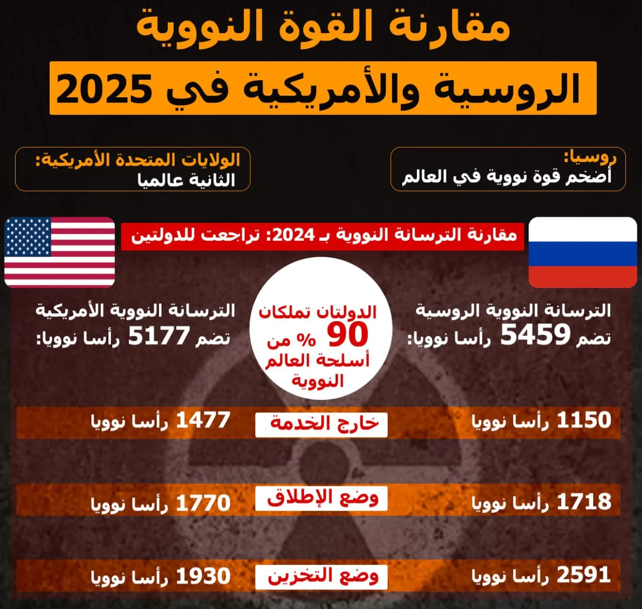 تمتلك روسيا أضخم ترسانة نووية في العالم في 2025، تليها الولايات المتحدة الأمريكية، ويقدّر حجم ما تملكه الدولتان بنحو 90 في المئة من إجمالي الأسلحة النووية التي تملكها الدول الـ 9 النووية في العالم.