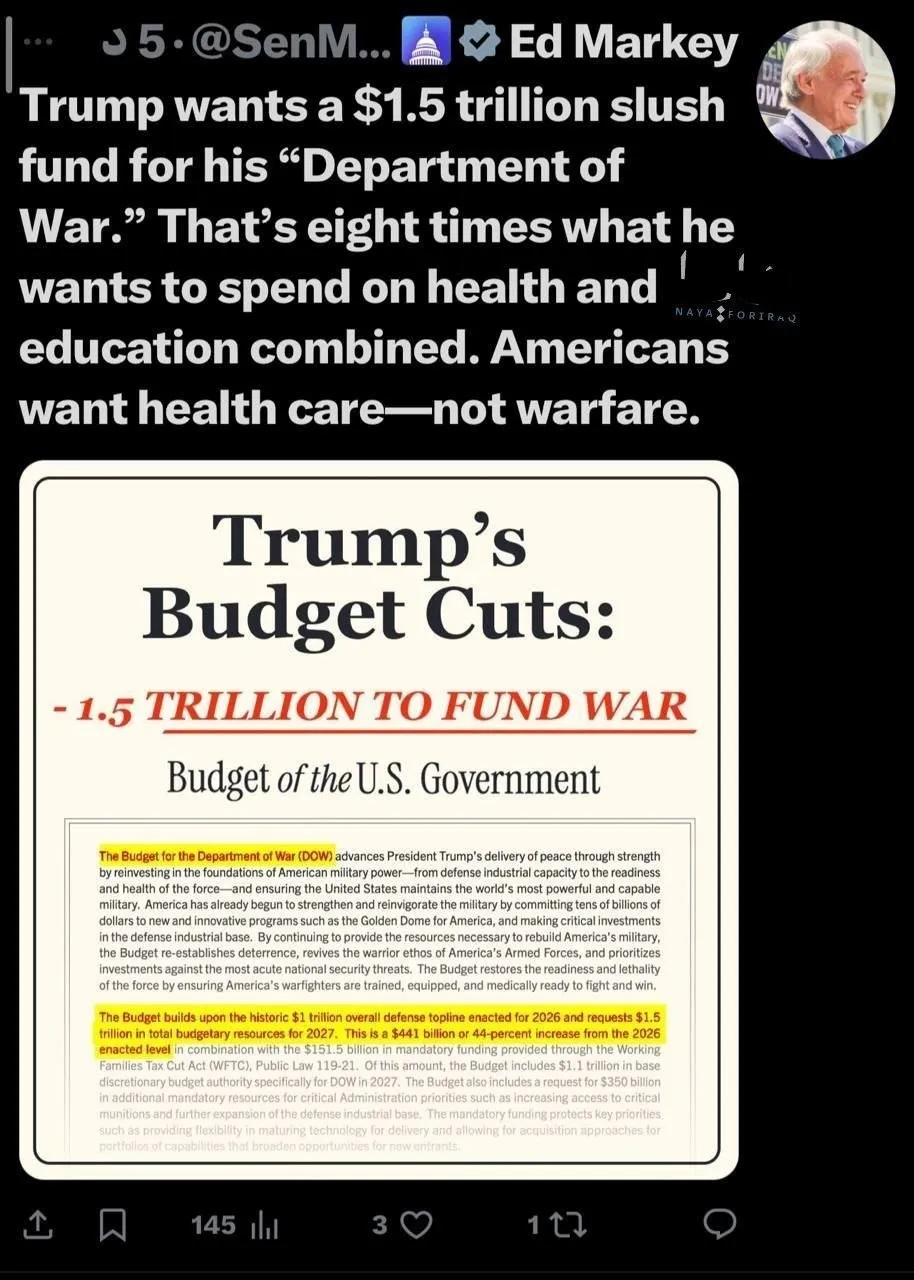ومن ناحية أخرى قال عضو مجلس الشيوخ الامريكي إد ماركي: يريد ترامب صندوقاً سرياً بقيمة 1.5 تريليون دولار لـ"وزارة الحرب" التابعة له. هذا المبلغ يعادل ثمانية أضعاف ما يريد إنفاقه على الصحة والتعليم مجتمعين. الأمريكيون يريدون الرعاية الصحية، لا الحرب.